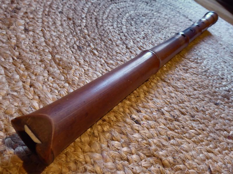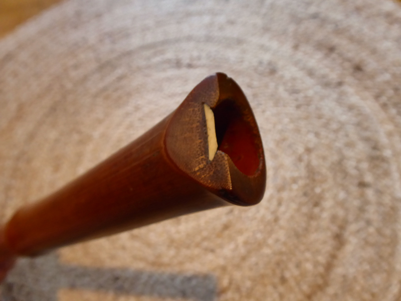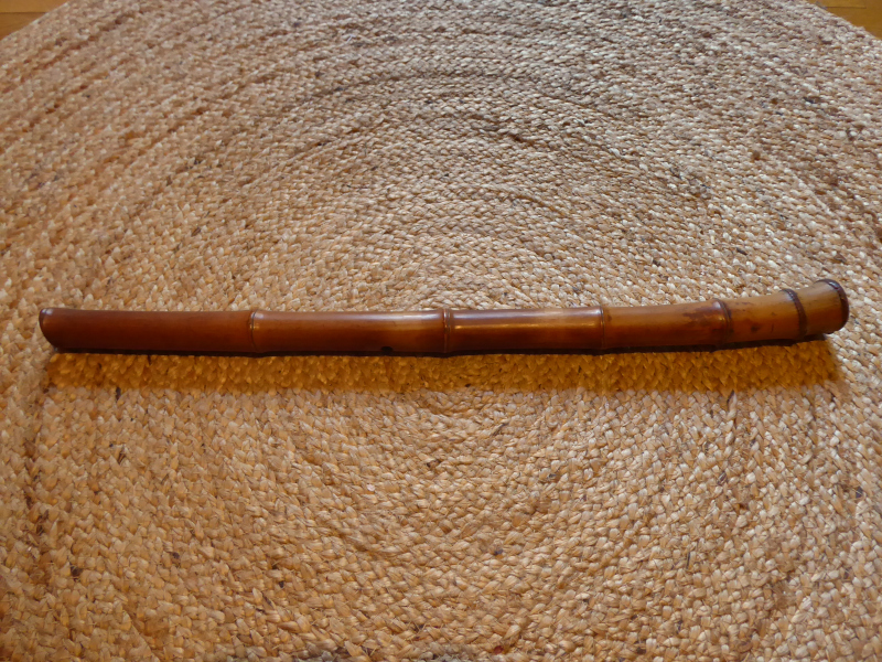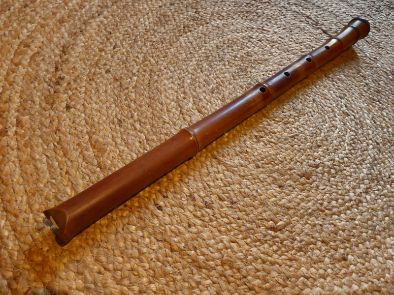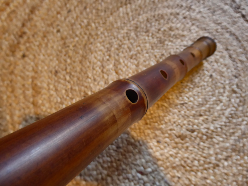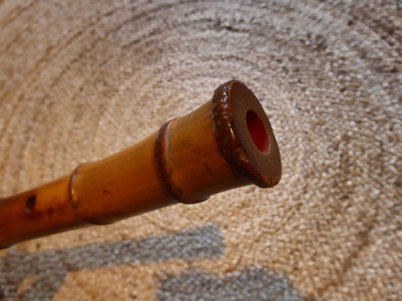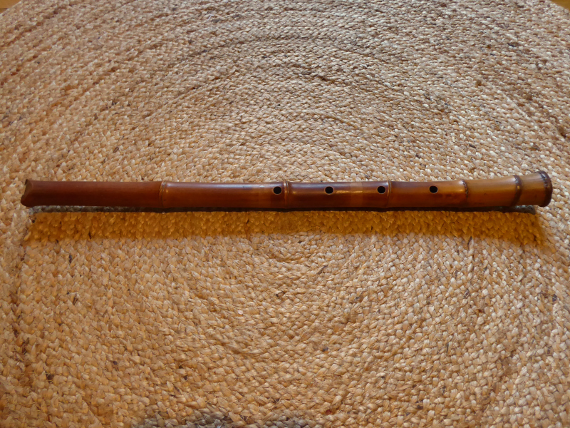 It is made from a thin piece of bamboo thus the embouchure is pretty tight but once you get used to it, it has a good playability up to dai kan. The brown patina is beautiful; It has some tanning marks of former bindings)